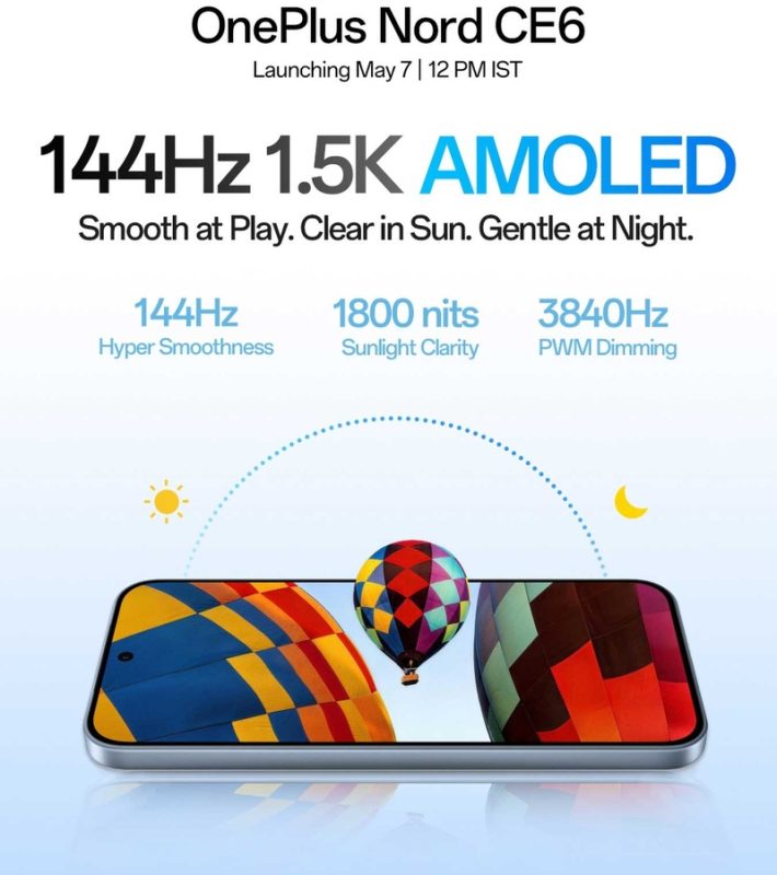 OnePlus Nord CE6 sử dụng màn hình AMOLED 6,78 inch, độ phân giải 1.5K, tần số quét 144 Hz, mang lại trải nghiệm hiển thị mượt khi cuộn và chơi game. Công nghệ PWM 3.840 Hz giúp giảm nhấp nháy, hạn chế mỏi mắt khi sử dụng trong thời gian dài.